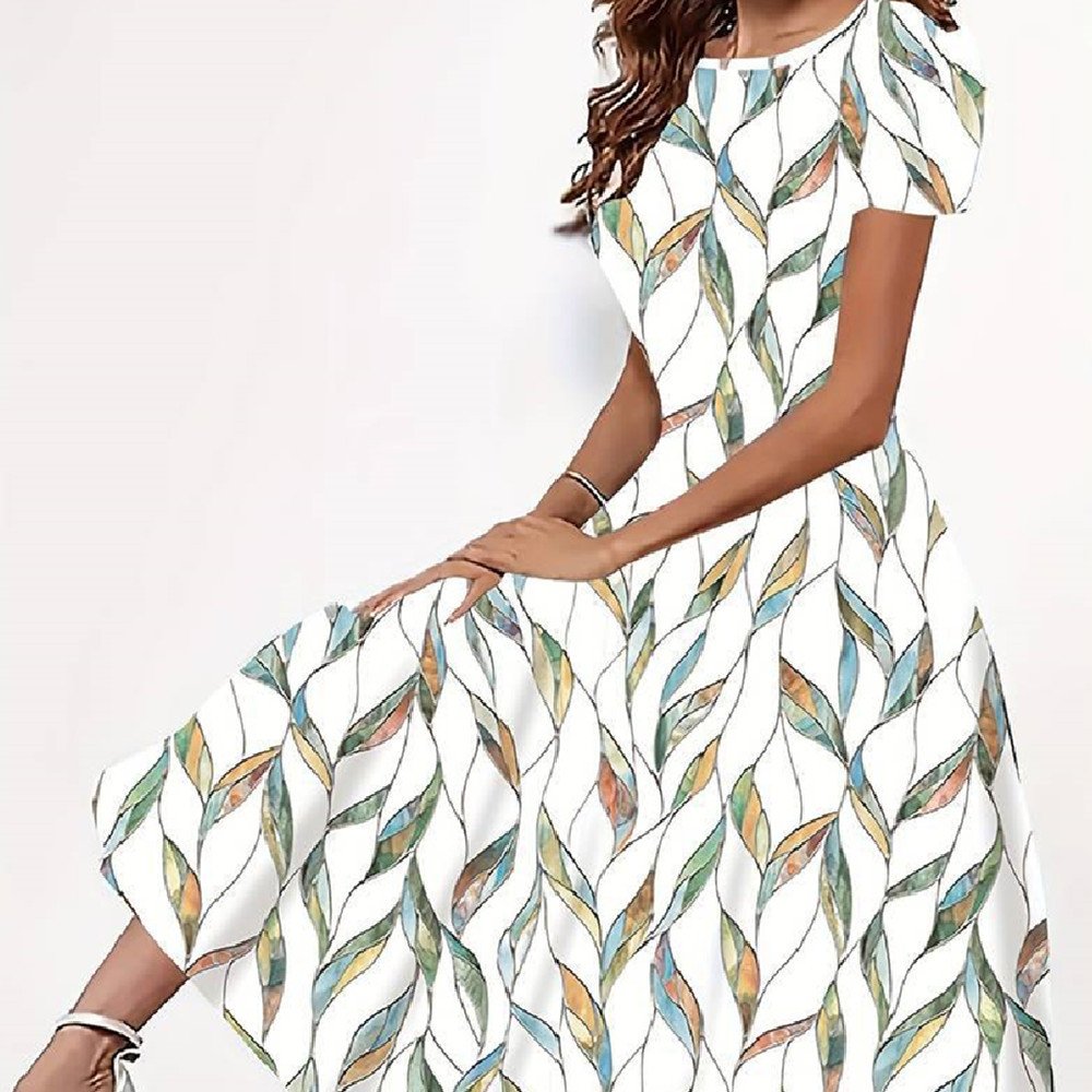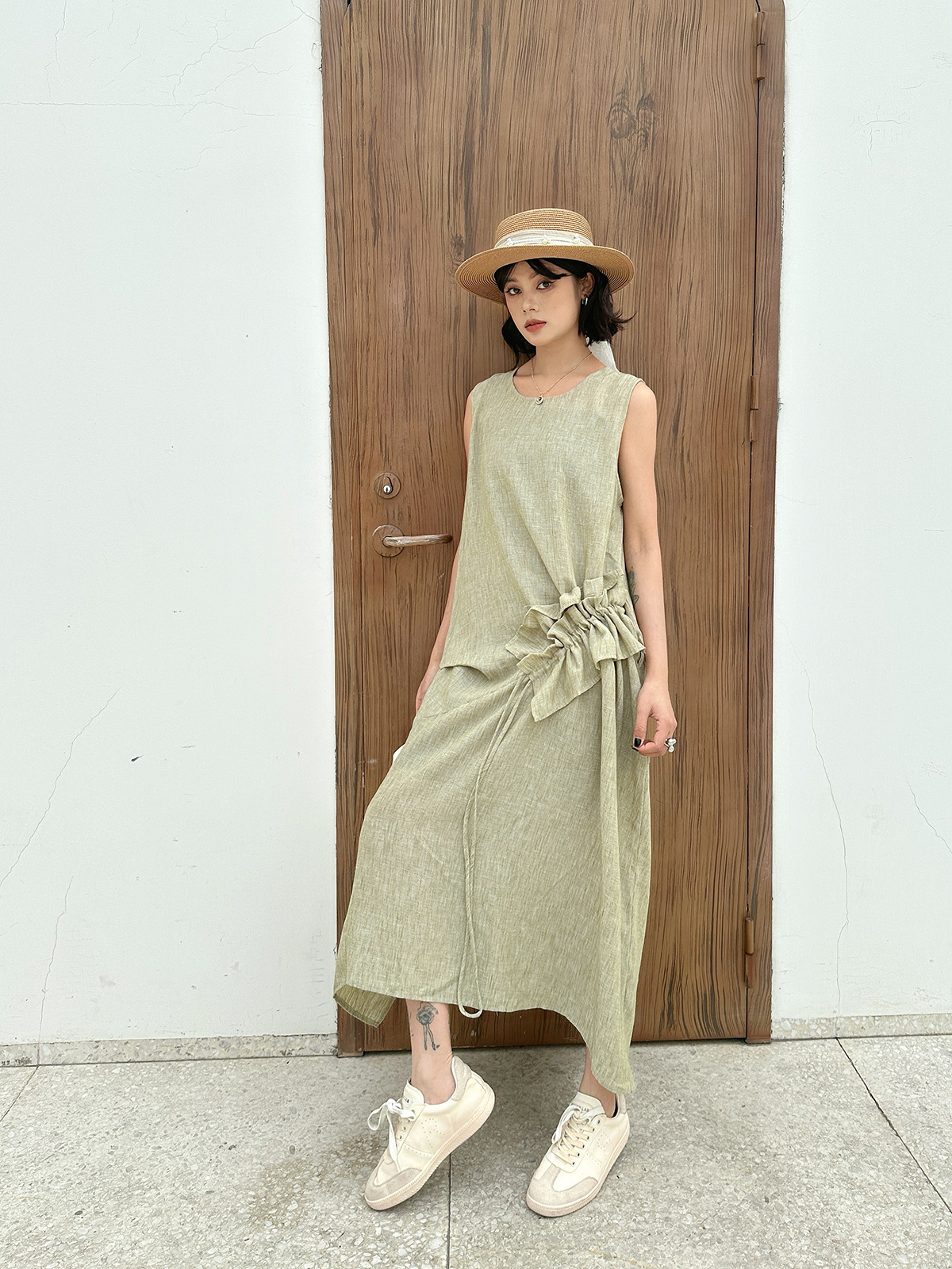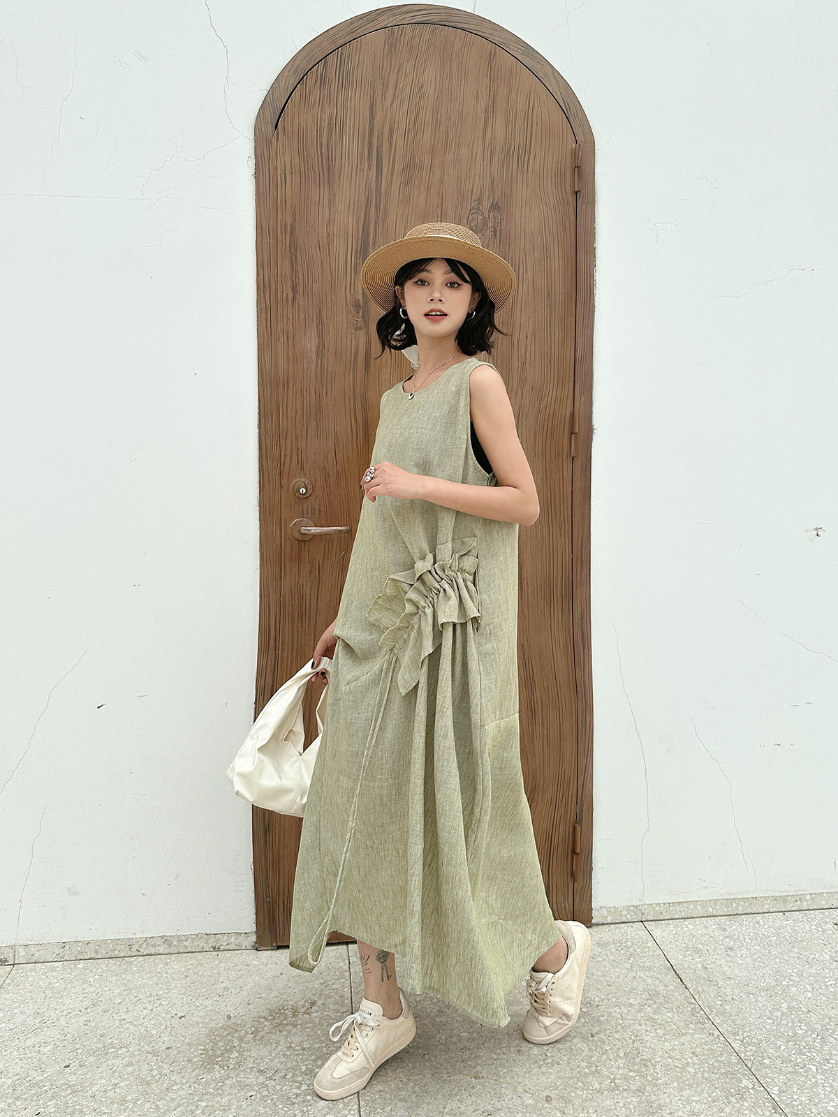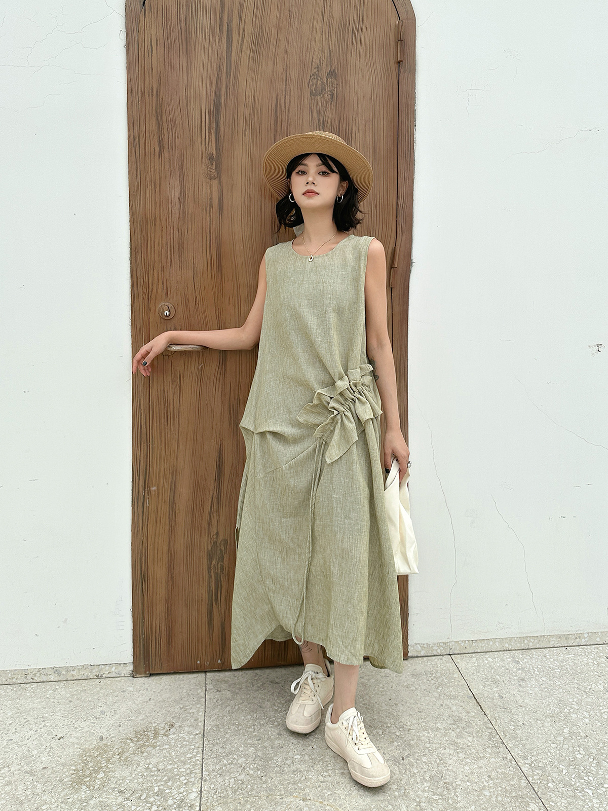 Women’s Retro Crew Neck Patchwork Ruffled Drawstring Sleeveless Dress